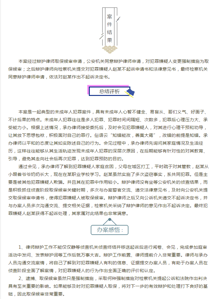 杨卫华律师承办赵某盗窃案获检察机关不起诉决定处理 来源:求是和信网 日期:2018-05-18 11:31 发布人:qshx 浏览量: 806 上一篇:新旧动能转换背景下企业知识产权法律保护工作研讨会顺利召开 下一篇:求是动态 | 我所青年律师闪耀“大成杯”诉辩赛场 专业素养与团队协作铸就卓越战绩