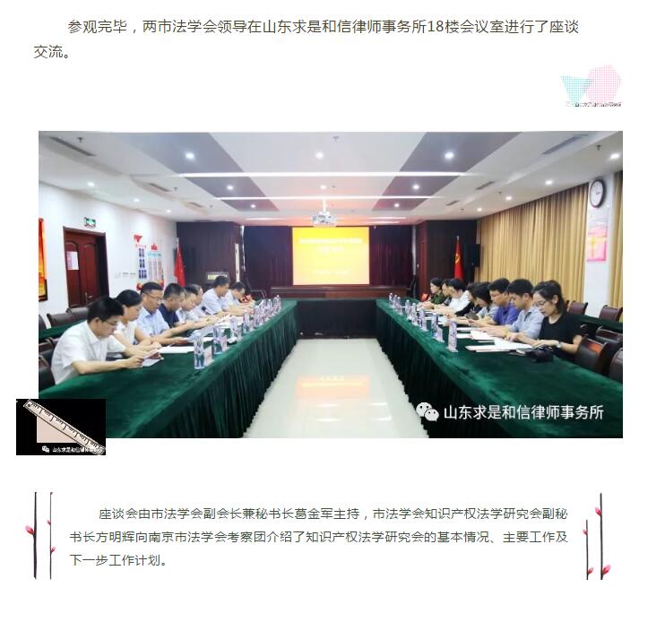 南京市法学会考察团到市法学会知识产权法学研究会参观考察 来源:求是和信网 日期:2018-07-18 10:20 发布人:qshx 浏览量: 714 上一篇:潍坊市政协委员奎文活动组莅临山东求是和信律师事务所视察指导 下一篇:求是动态 | 我所青年律师闪耀“大成杯”诉辩赛场 专业素养与团队协作铸就卓越战绩