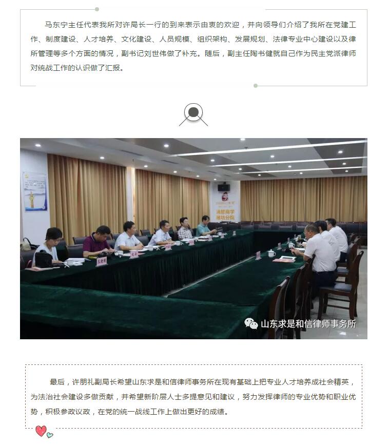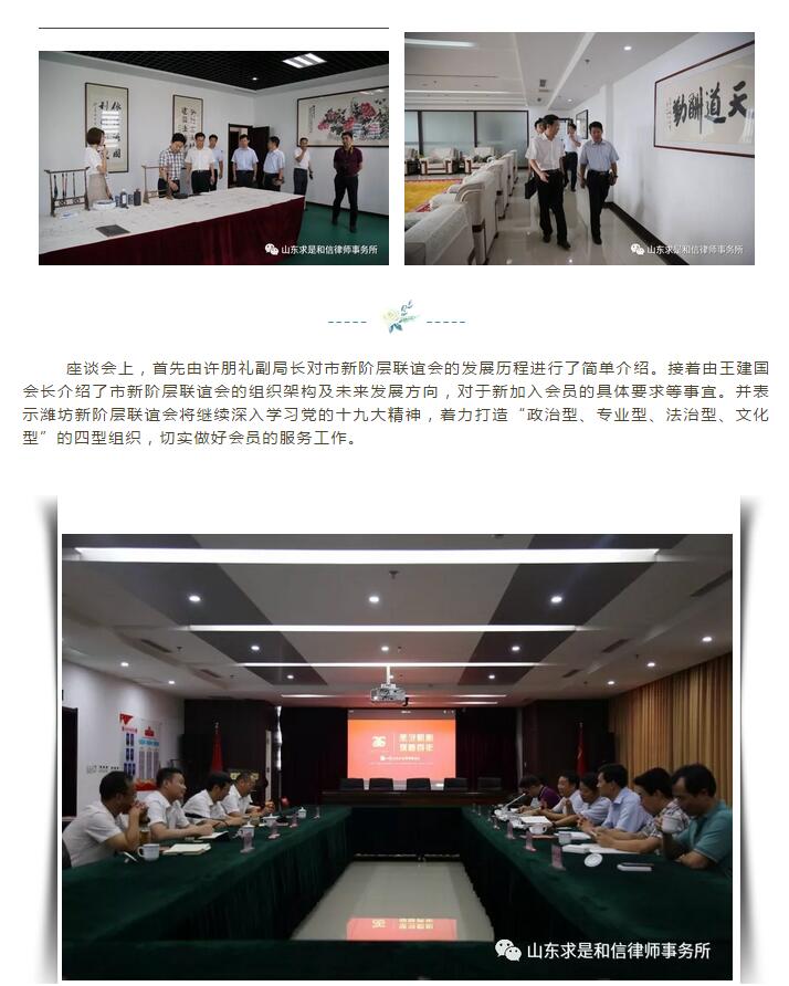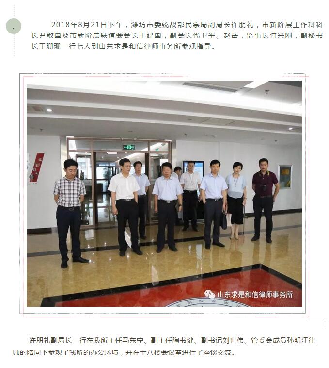 潍坊市委统战部民宗局副局长许朋礼及市新阶层联谊会会长王建国等一行莅临山东求是和信律师事务所参观指导 来源:求是和信网 日期:2018-08-22 10:34 发布人:qshx 浏览量: 886 上一篇:凝心聚力,展现风采——求是和信篮球联队再接再厉拿下第三场比赛胜利 下一篇:求是动态 | 我所青年律师闪耀“大成杯”诉辩赛场 专业素养与团队协作铸就卓越战绩