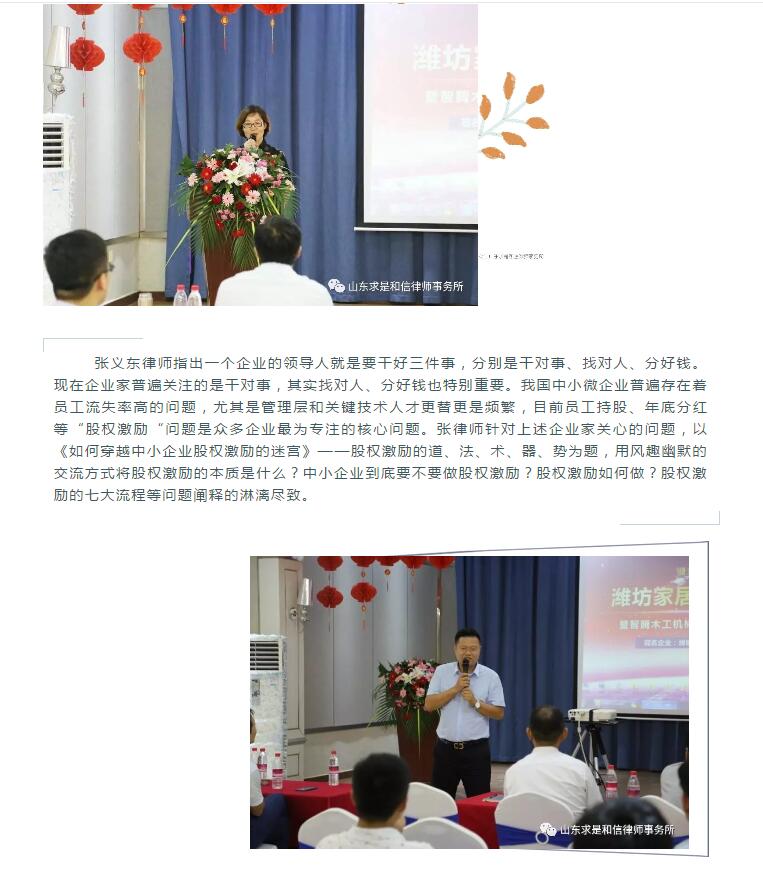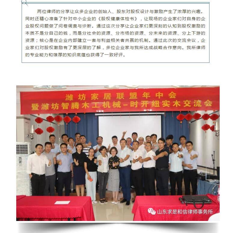 山东求是和信律师事务所张义东、李桂平律师参加潍坊家居联盟《股权设计与激励》交流会 来源:求是和信网 日期:2018-09-11 17:15 发布人:qshx 浏览量: 878 上一篇:『求是动态』抗灾救灾 我们在行动 下一篇:求是动态 | 我所青年律师闪耀“大成杯”诉辩赛场 专业素养与团队协作铸就卓越战绩
