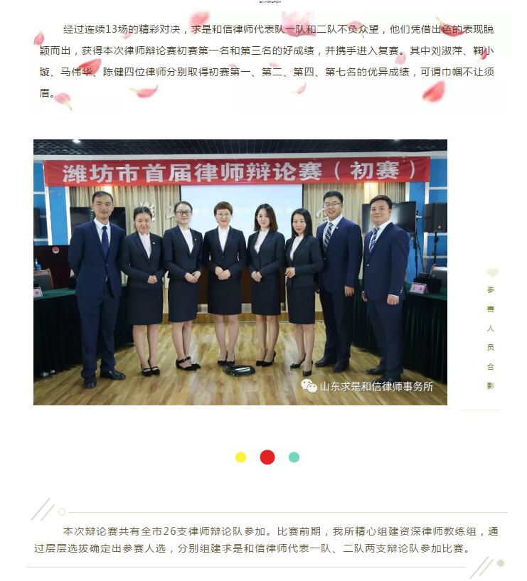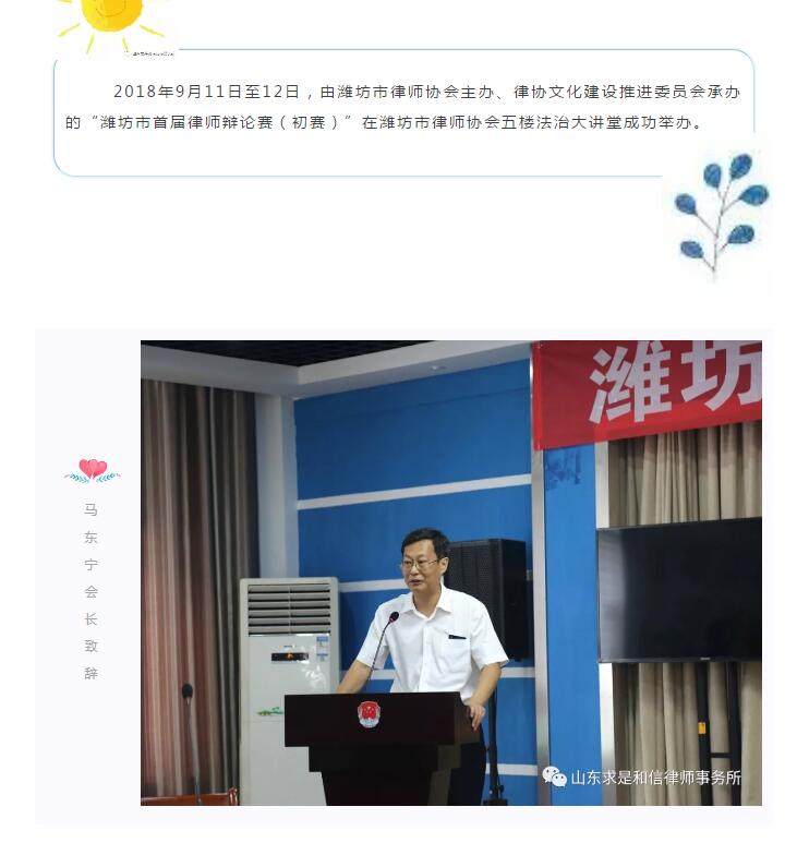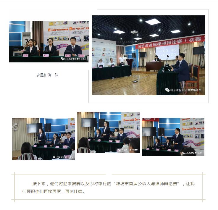 山东求是和信律师事务所代表队在“潍坊市首届律师辩论赛(初赛)”中取得优异成绩 来源:求是和信网 日期:2018-09-13 15:28 发布人:qshx 浏览量: 806 上一篇:山东求是和信律师事务所张义东、李桂平律师参加潍坊家居联盟《股权设计与激励》交流会 下一篇:求是动态 | 我所青年律师闪耀“大成杯”诉辩赛场 专业素养与团队协作铸就卓越战绩