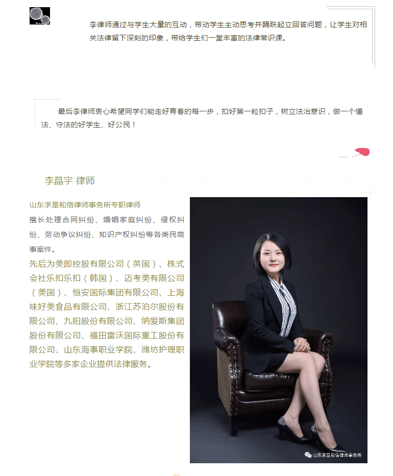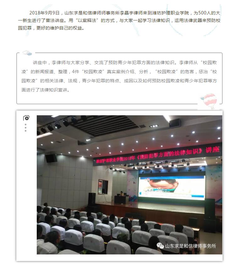 山东求是和信律师事务所李晶宇律师到潍坊护理职业学院进行普法讲座 来源:求是和信网 日期:2018-09-17 09:56 发布人:qshx 浏览量: 758 上一篇:山东求是和信律师事务所代表队在“潍坊市首届律师辩论赛(初赛)”中取得优异成绩 下一篇:求是动态 | 我所青年律师闪耀“大成杯”诉辩赛场 专业素养与团队协作铸就卓越战绩