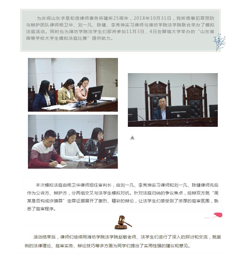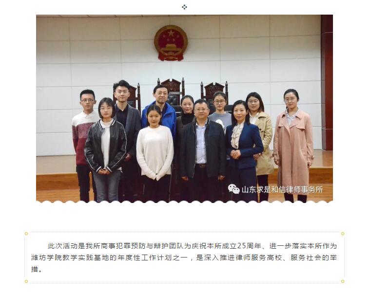 山东求是和信律师事务所商事犯罪预防与辩护团队律师与潍坊学院法学院联合举办模拟法庭 山东求是和信律师事务所 4天前