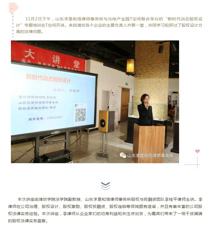 山东求是和信律师事务所与光电产业园T空间“新时代动态股权设计”专题培训成功举办