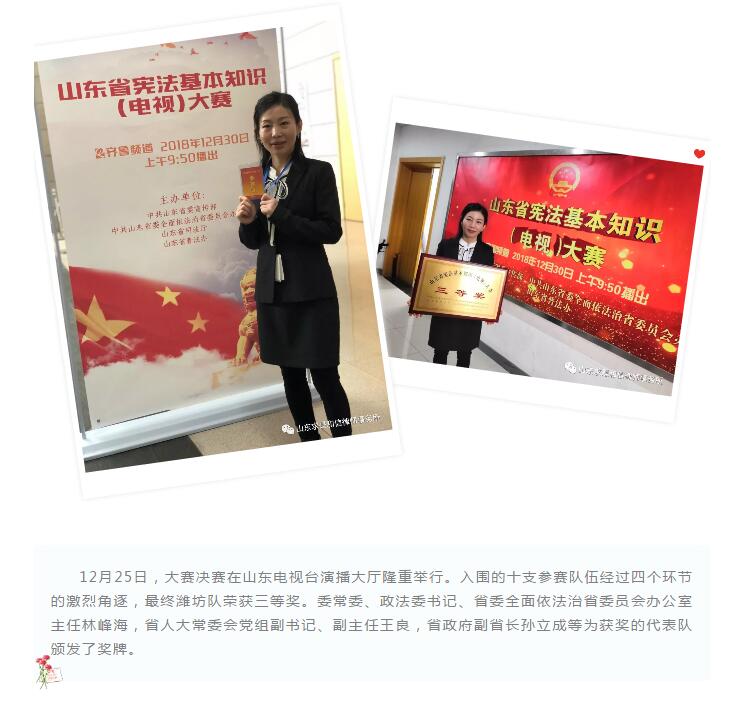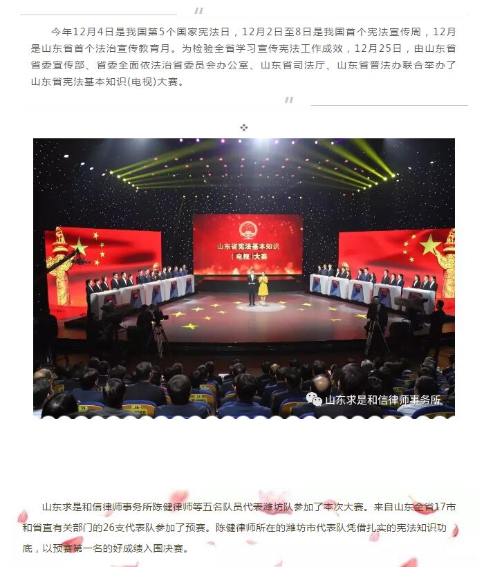 山东求是和信律师事务所陈健律师参加山东省宪法基本知识(电视)大赛获奖 来源:求是和信网 日期:2019-01-02 09:43 发布人:qshx 浏览量: 802 上一篇:山东求是和信律师事务所携手潍坊民革开展“博爱大讲堂”公益活动 下一篇:求是动态 | 我所青年律师闪耀“大成杯”诉辩赛场 专业素养与团队协作铸就卓越战绩
