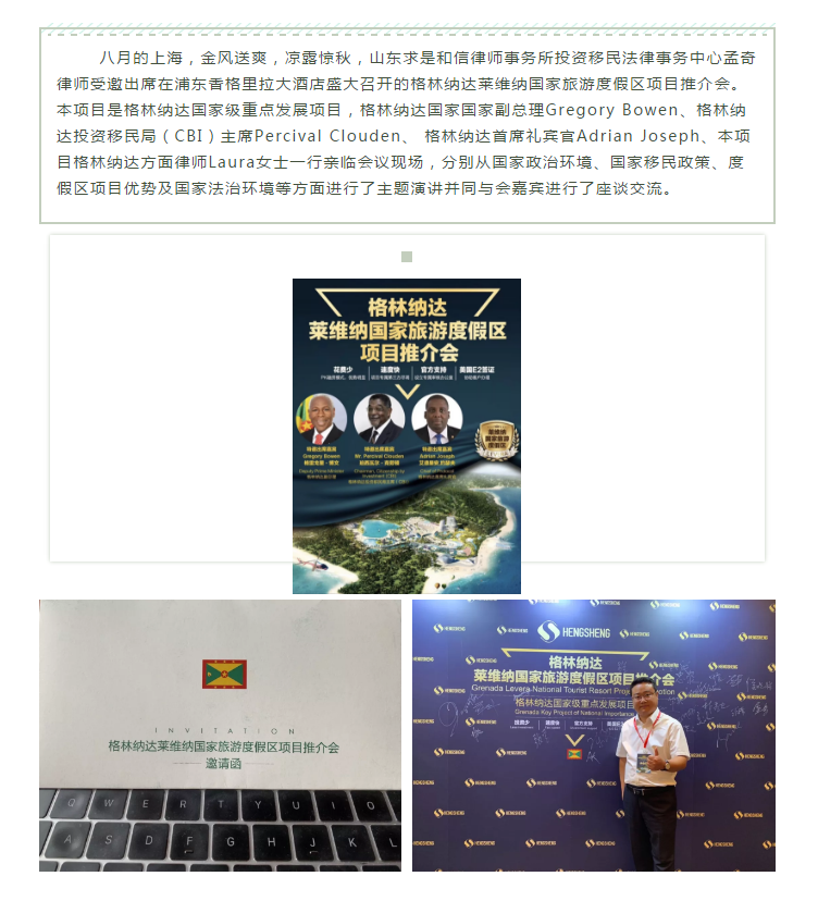 山东求是和信律师事务所孟奇律师受邀出席格林纳达莱维纳国家旅游度假区项目推介会 来源:求是和信网 日期:2019-09-04 15:18 发布人:qshx 浏览量: 850 上一篇:“国宗杯”第二届律师篮球友谊赛决赛暨闭幕式在锐邦球馆举行 下一篇:求是动态 | 我所青年律师闪耀“大成杯”诉辩赛场 专业素养与团队协作铸就卓越战绩