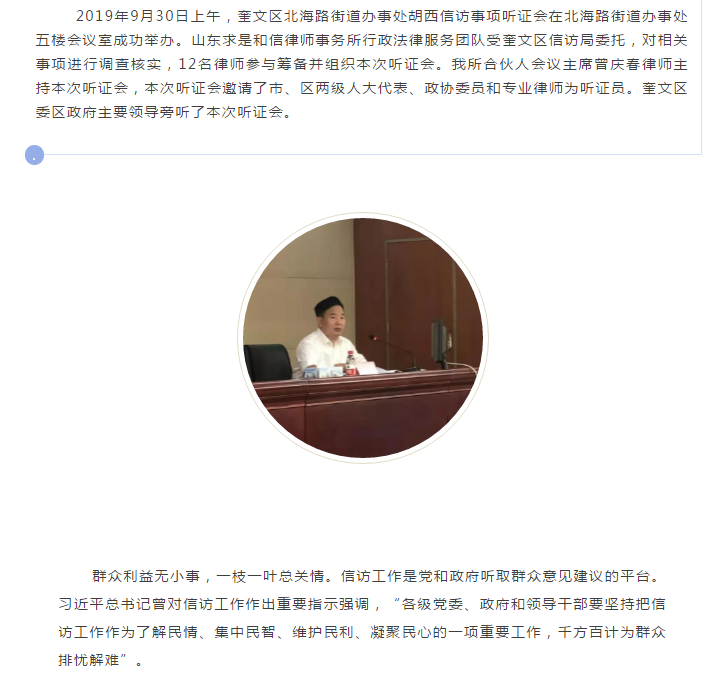 山东求是和信律师事务所曾庆春律师主持的奎文区北海路街道办事处胡西信访事项听证会成功举办 来源:求是和信网 日期:2019-10-14 11:37 发布人:qshx 浏览量: 877 上一篇:山东求是和信律师事务所举办青年律师培训 下一篇:求是动态 | 我所青年律师闪耀“大成杯”诉辩赛场 专业素养与团队协作铸就卓越战绩