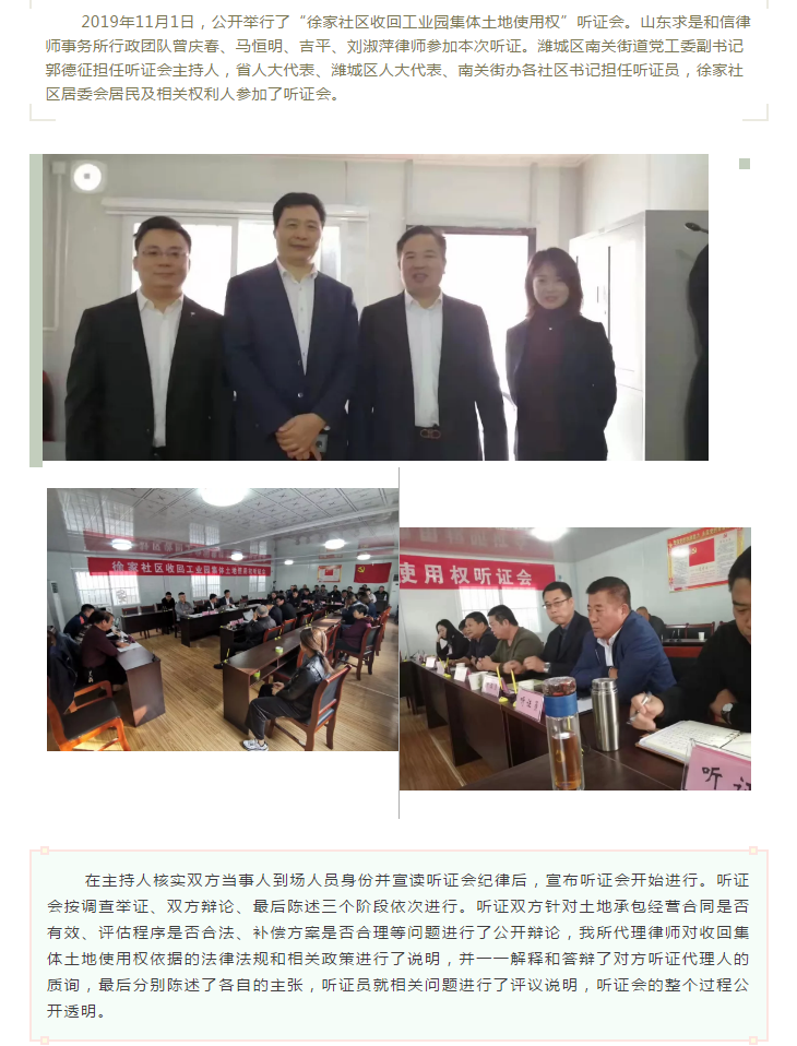 山东求是和信律师事务所行政法律团队参加南关街办徐家工业园集体土地使用权收回听证会 来源:求是和信网 日期:2019-11-05 15:50 发布人:qshx 浏览量: 865 上一篇:山东求是和信律师事务所沈子清律师应邀到潍坊经济开发区教育局组织开展普法讲座 下一篇:求是动态 | 我所青年律师闪耀“大成杯”诉辩赛场 专业素养与团队协作铸就卓越战绩