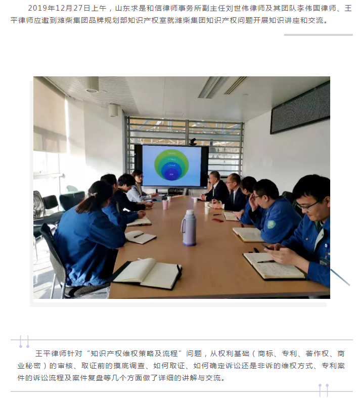 我所律师为顾问单位潍柴集团进行知识产权培训 来源:求是和信网 日期:2020-01-03 09:55 发布人:qshx 浏览量: 1246 上一篇:我所股权与投融资团队辅导潍坊卫恩医院股权激励项目成功落地 下一篇:求是动态 | 我所青年律师闪耀“大成杯”诉辩赛场 专业素养与团队协作铸就卓越战绩