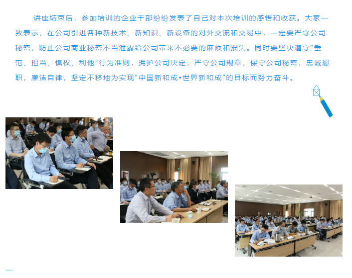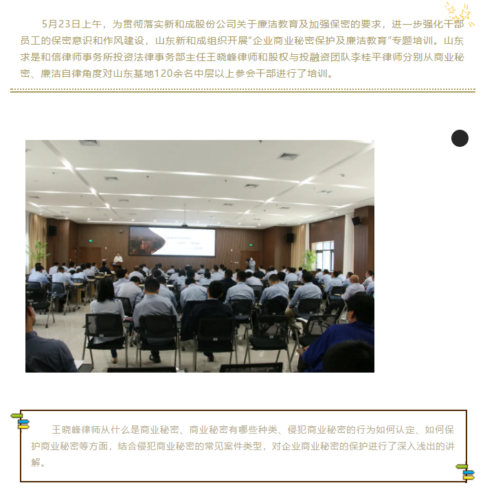 『求是动态』我所王晓峰、李桂平律师对山东新和成中层干部进行商业秘密保护和廉洁自律专题培训 来源:求是和信网 日期:2020-06-04 16:02 发布人:qshx 浏览量: 810 上一篇:『求是动态』窦荣刚律师为青年律师讲授律师业务中的刑事风险 下一篇:求是动态 | 我所青年律师闪耀“大成杯”诉辩赛场 专业素养与团队协作铸就卓越战绩