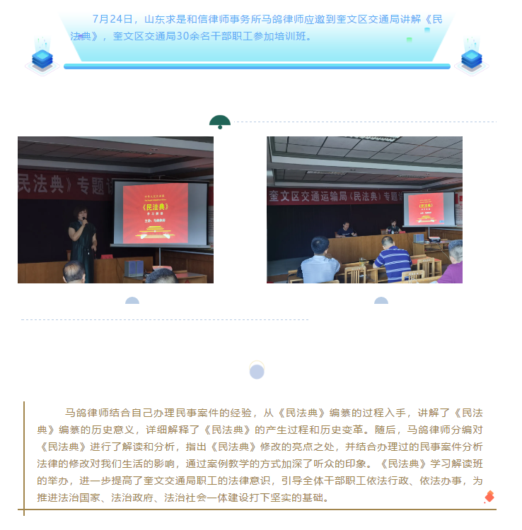 山东求是和信律师事务所马鸽律师应邀到奎文区交通局讲解《民法典》 来源:求是和信网 日期:2020-07-30 09:29 发布人:qshx 浏览量: 706 上一篇:山东求是和信律师事务所李晶宇律师做客“银龄之声”节目 下一篇:求是动态 | 我所青年律师闪耀“大成杯”诉辩赛场 专业素养与团队协作铸就卓越战绩