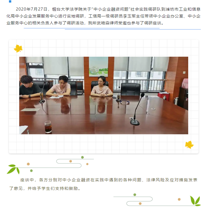 我所武艳霞律师参与烟台大学法学院与潍坊市工业和信息化局的社会实践调研座谈会 来源:求是和信网 日期:2020-07-30 09:40 发布人:qshx 浏览量: 2096 上一篇:我所邀请山东瀛岱律师事务所陈士宽主任为大家作题为《新商业文明的法商融合》的分享会 下一篇:求是动态 | 我所青年律师闪耀“大成杯”诉辩赛场 专业素养与团队协作铸就卓越战绩