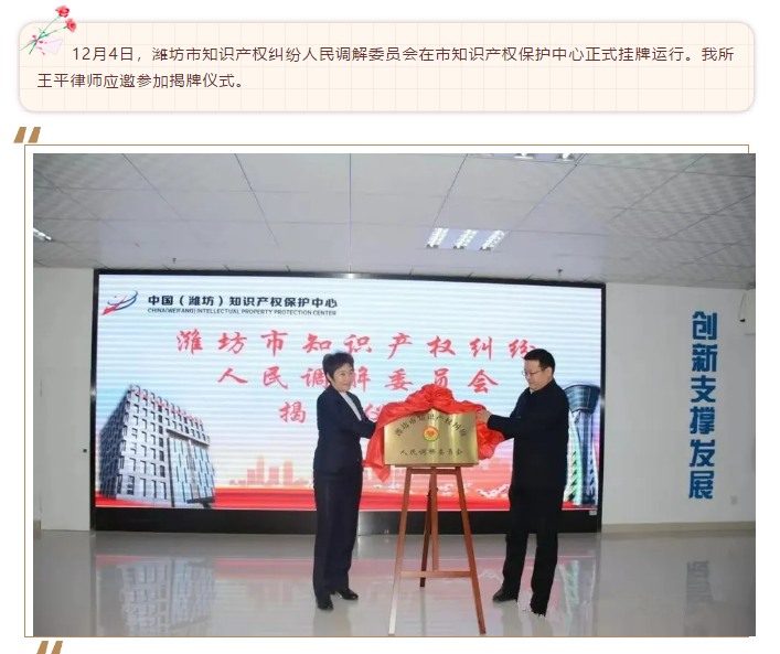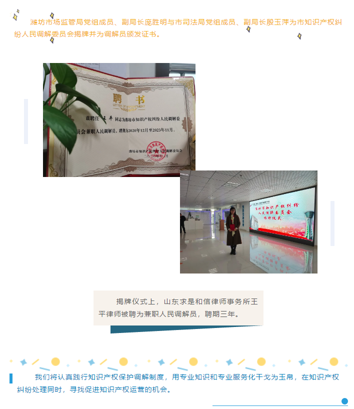 『求是动态』我所王平律师被聘为潍坊市知识产权纠纷人民调解委员会兼职人民调解员