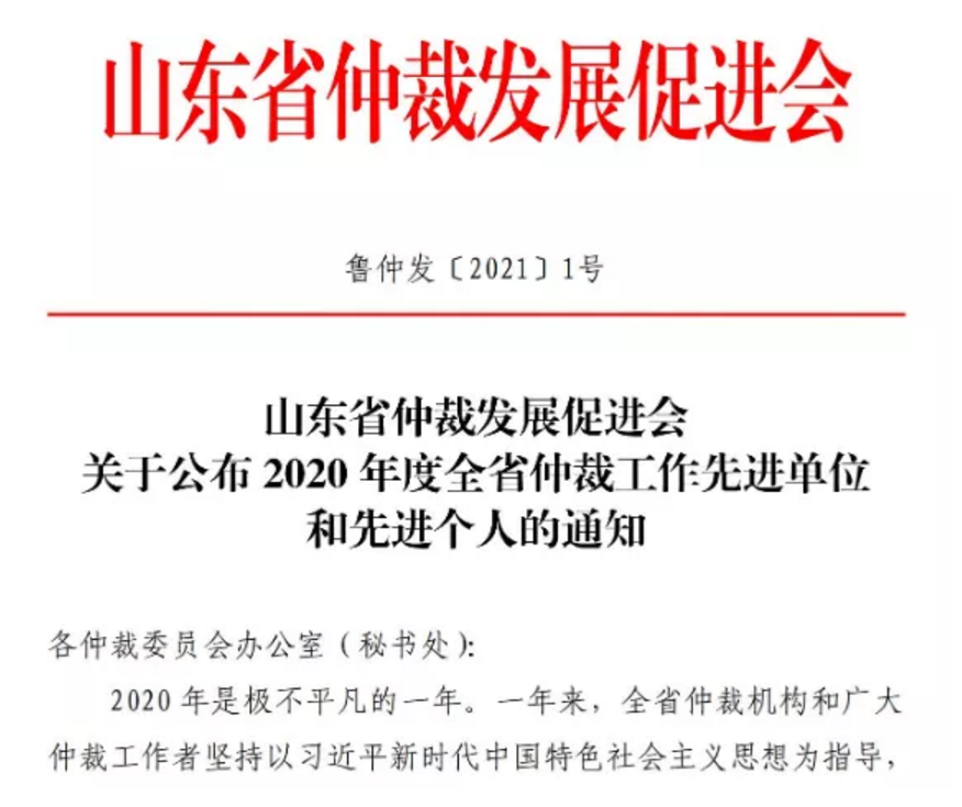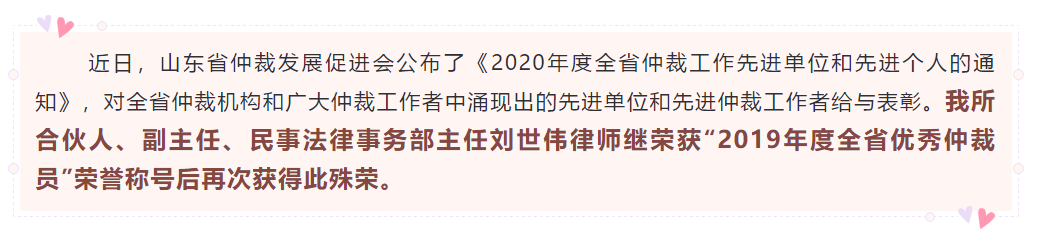 【求是荣誉】我所刘世伟律师再次获评“2020年度山东省优秀仲裁员”