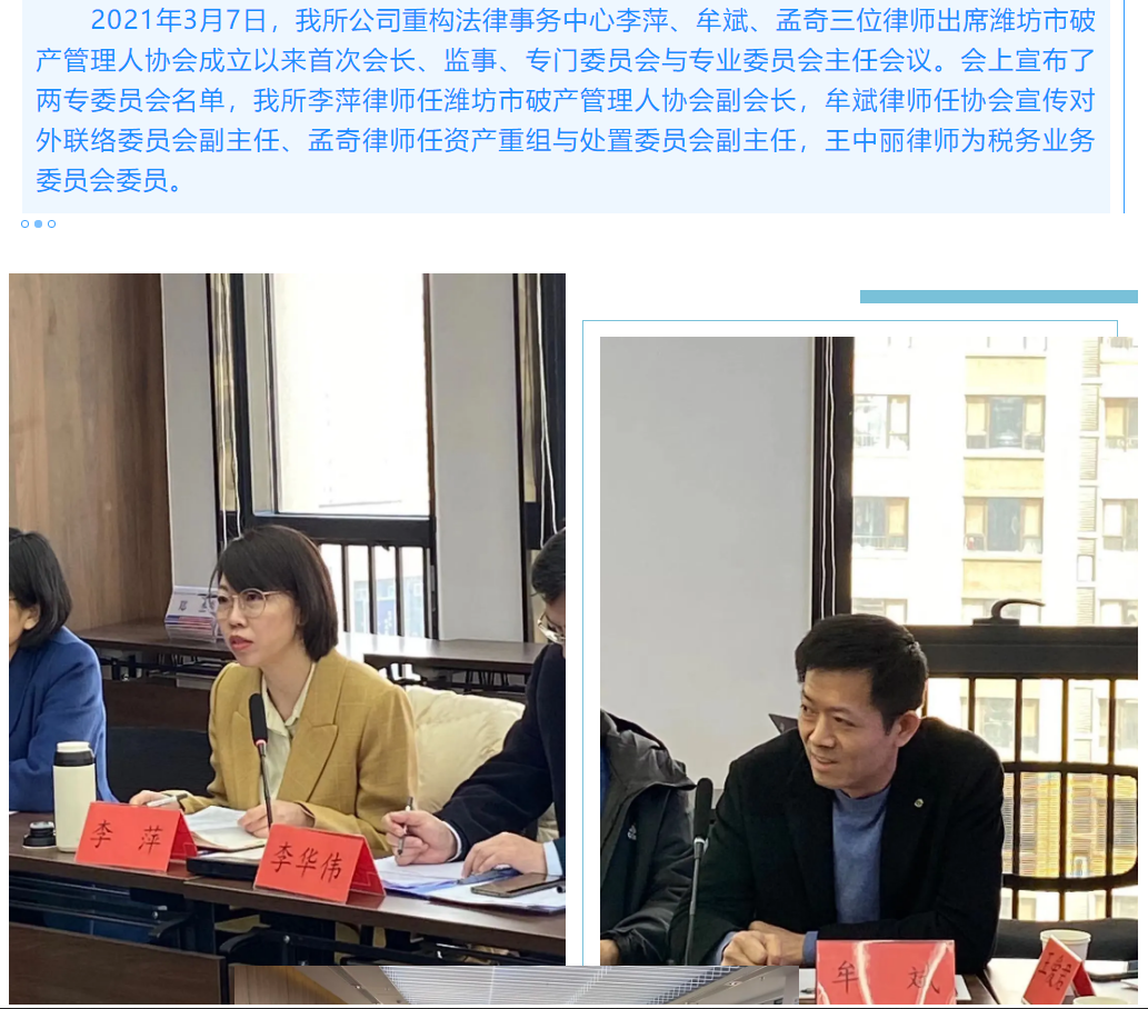 【求是资讯】公司重构法律事务中心团队律师出席潍坊市破产管理人协会第一次“两专”委员会会议 来源:求是和信网 日期:2021-03-13 11:20 发布人:qshx 浏览量: 3004 上一篇:『求是资讯』行政法律中心曾庆春主任、刘东律师为昌乐县退役军人事务局作讲座 下一篇:求是动态 | 我所青年律师闪耀“大成杯”诉辩赛场 专业素养与团队协作铸就卓越战绩