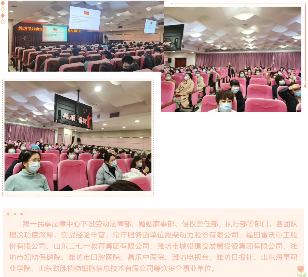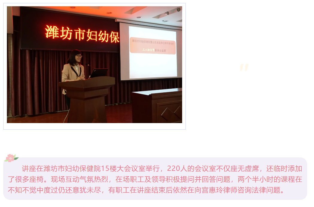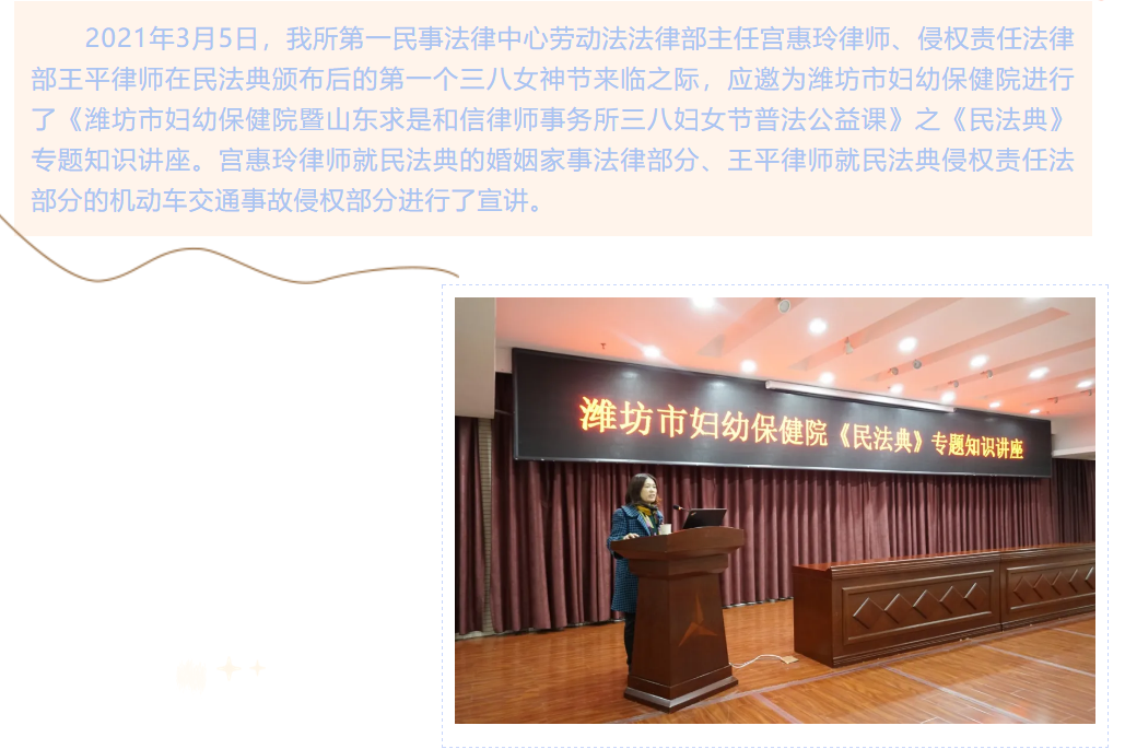 『求是资讯』我所宫惠玲、王平律师应邀为潍坊市妇幼保健院进行《民法典》专题知识讲座 来源:求是和信网 日期:2021-03-17 14:16 发布人:qshx 浏览量: 2027 上一篇:【求是资讯】公司重构法律事务中心团队律师出席潍坊市破产管理人协会第一次“两专”委员会会议 下一篇:求是动态 | 我所青年律师闪耀“大成杯”诉辩赛场 专业素养与团队协作铸就卓越战绩
