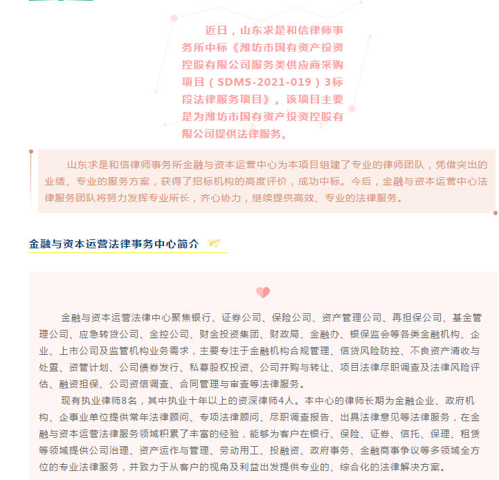 求是和信【金融与资本运营中心】为潍坊市国有资产投资控股有限公司提供法律服务 来源:求是和信网 日期:2021-06-08 16:04 发布人:qshx 浏览量: 2266 上一篇:山东求是和信律师事务所马鸽律师应邀为潍城区交通局全体员工作新《行政处罚法》专题培训 下一篇:求是动态 | 我所青年律师闪耀“大成杯”诉辩赛场 专业素养与团队协作铸就卓越战绩