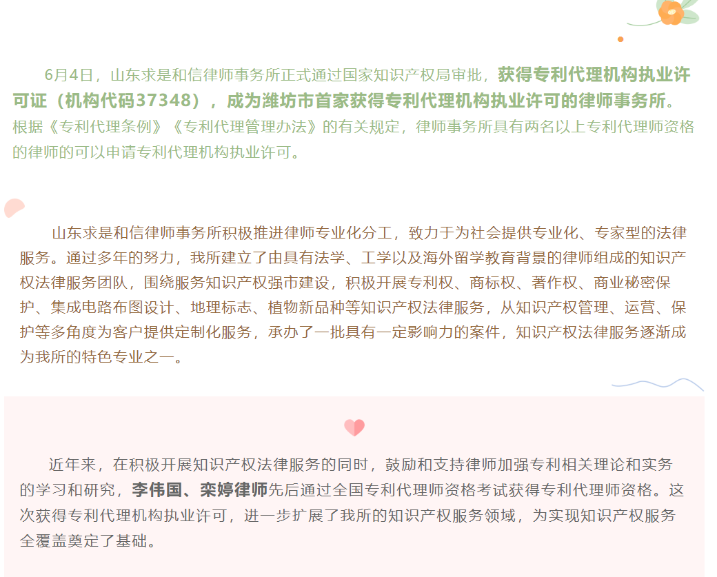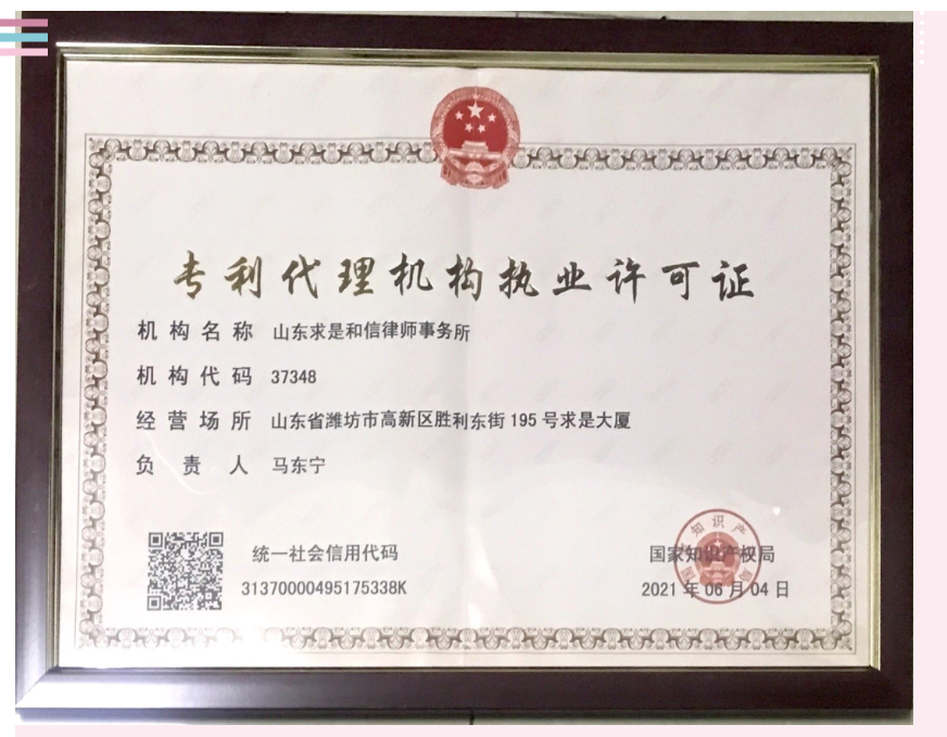 『求是动态』山东求是和信律师事务所喜获专利代理机构执业许可 来源:求是和信网 日期:2021-06-28 11:40 发布人:qshx 浏览量: 3078 上一篇:我为群众办实事|求是和信律师在行动(二十二) 下一篇:求是动态 | 我所青年律师闪耀“大成杯”诉辩赛场 专业素养与团队协作铸就卓越战绩