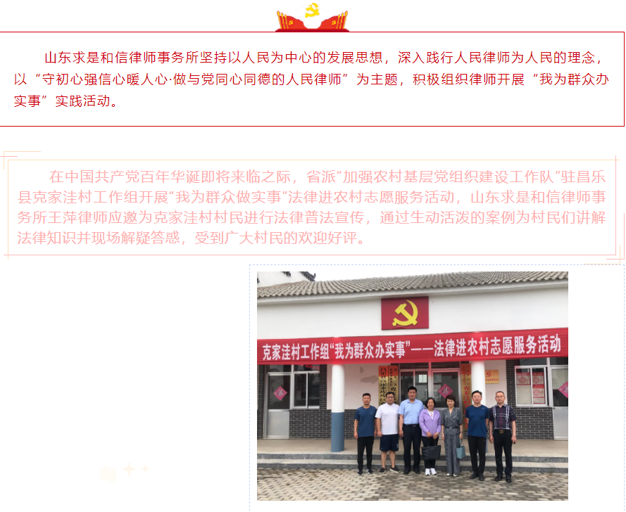 我为群众办实事|求是和信律师在行动(二十六) 来源:求是和信网 日期:2021-07-07 14:39 发布人:qshx 浏览量: 2500 上一篇:山东求是和信律师事务所庆祝建党100周年“诵读红色经典,致敬光辉百年”主题朗读会成功举办 下一篇:求是动态 | 我所青年律师闪耀“大成杯”诉辩赛场 专业素养与团队协作铸就卓越战绩