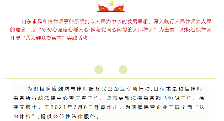 我为群众办实事|求是和信律师在行动(三十) 来源:求是和信网 日期:2021-07-30 14:42 发布人:qshx 浏览量: 2874 上一篇:我为群众办实事|求是和信律师在行动(二十九) 下一篇:求是动态 | 我所青年律师闪耀“大成杯”诉辩赛场 专业素养与团队协作铸就卓越战绩