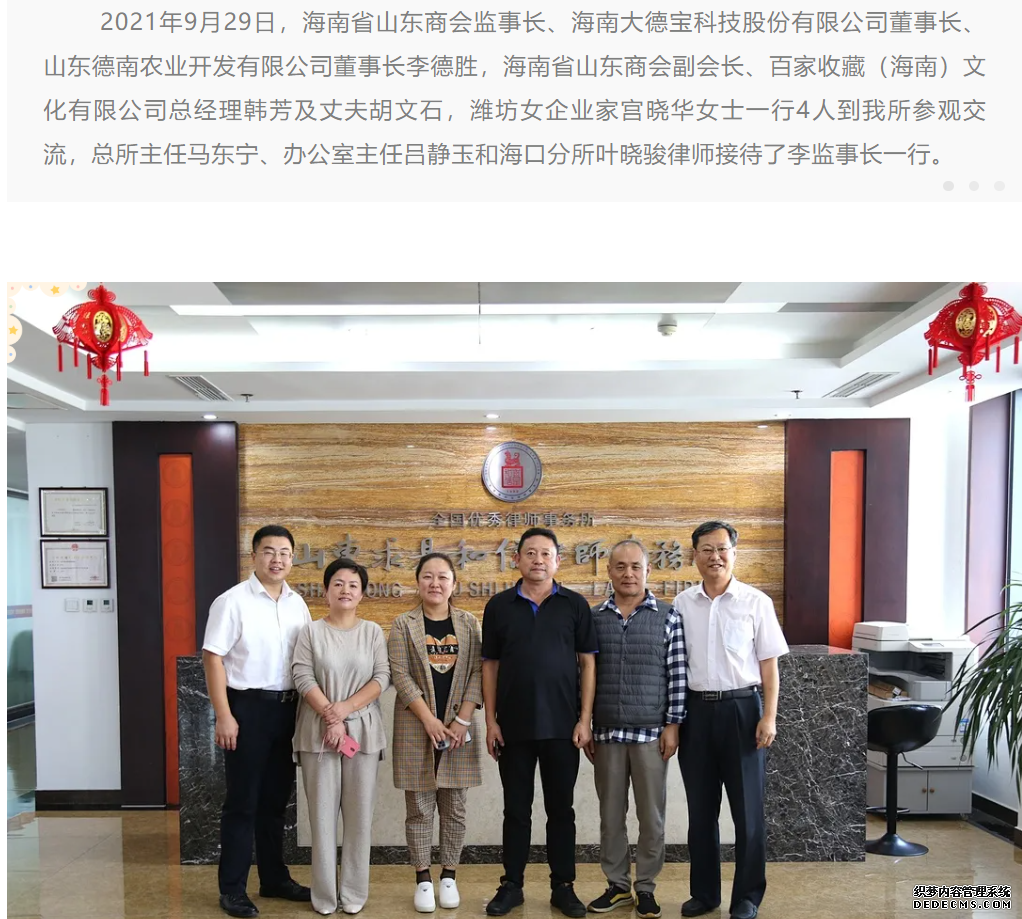海南省山东商会李德胜监事长一行到我所参观交流 来源:求是和信网 日期:2021-10-08 14:35 发布人:qshx 浏览量: 2266 上一篇:『求是动态』我所马东宁主任参加潍坊学院建校70周年捐赠仪式 下一篇:求是动态 | 我所青年律师闪耀“大成杯”诉辩赛场 专业素养与团队协作铸就卓越战绩