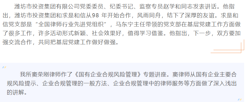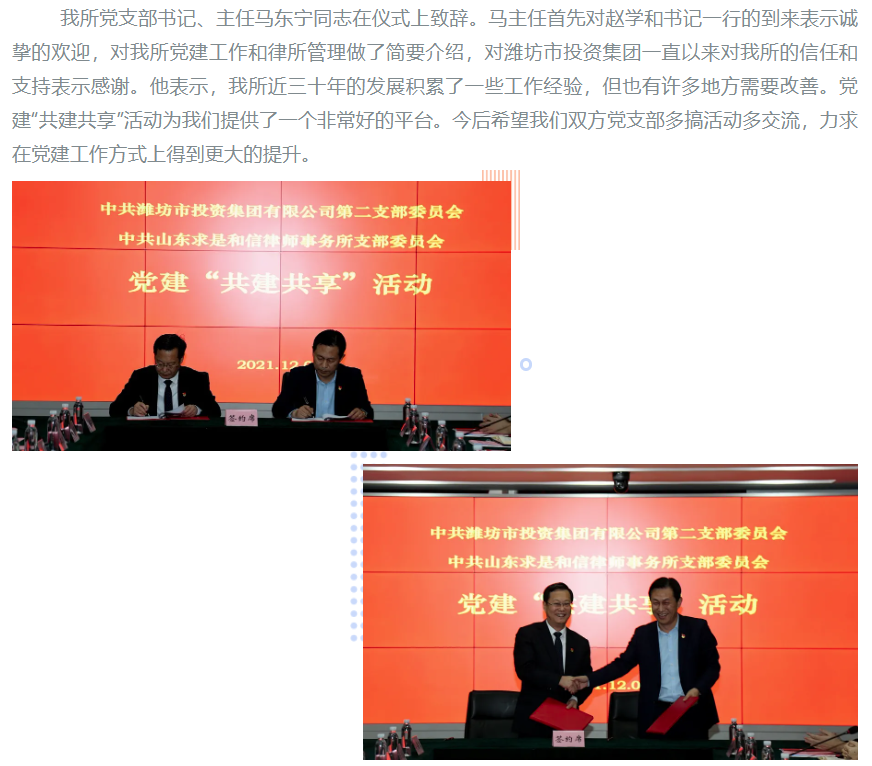 『求是动态』山东求是和信律师事务所与潍坊市投资集团有限公司党建“共建共享”协议签约仪式成功举行 来源:求是和信网 日期:2021-12-21 14:39 发布人:qshx 浏览量: 2536 上一篇:『求是动态』我所2021年下半年务虚会召开 下一篇:求是动态 | 我所青年律师闪耀“大成杯”诉辩赛场 专业素养与团队协作铸就卓越战绩