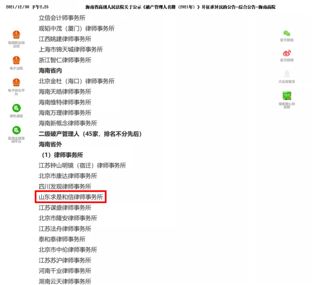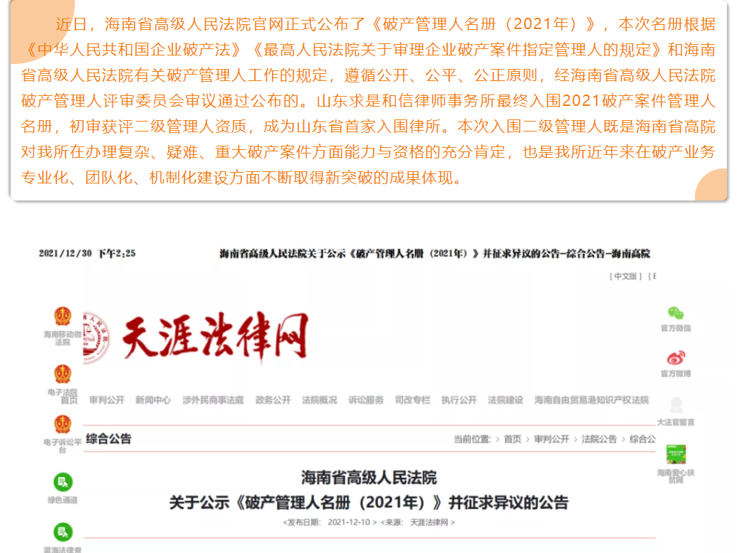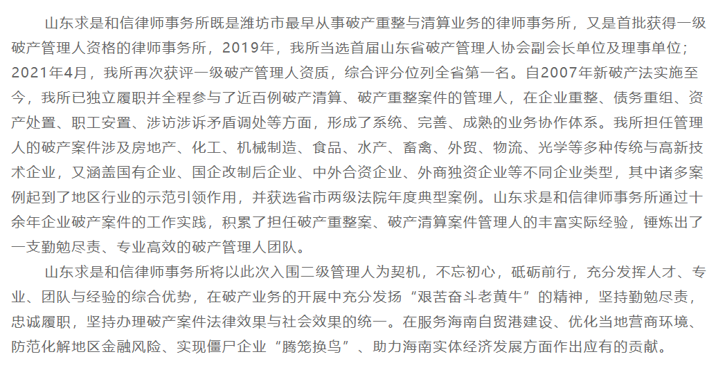 我所入围海南省高级人民法院2021破产案件管理人初审名册 来源:求是和信网 日期:2022-01-04 15:51 发布人:qshx 浏览量: 2653 上一篇:『求是动态』求是和信律师队勇夺2021潍坊市“盈科杯”第三届律师篮球友谊赛冠军 下一篇:求是动态 | 我所青年律师闪耀“大成杯”诉辩赛场 专业素养与团队协作铸就卓越战绩