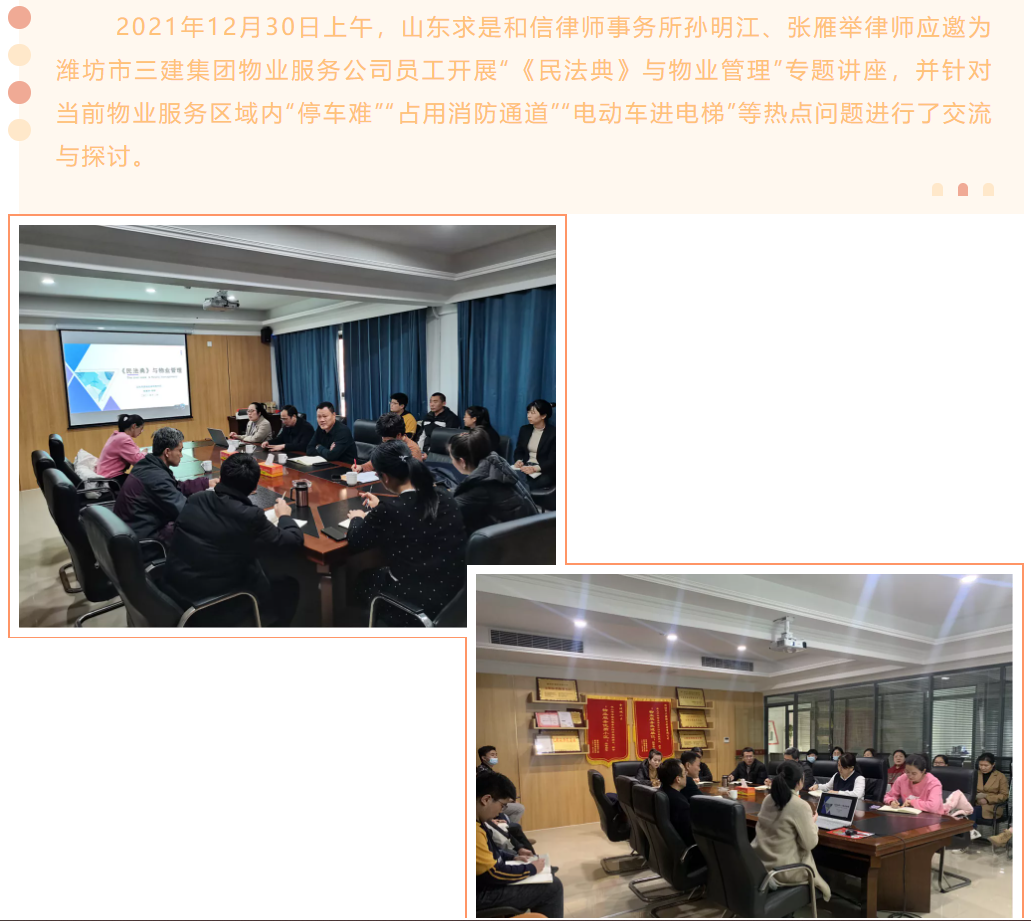 孙明江、张雁举律师应邀为潍坊市三建集团物业服务公司员工开展“《民法典》与物业管理”专题讲座 来源:求是和信网 日期:2022-01-04 16:09 发布人:qshx 浏览量: 2272 上一篇:“求是和信律师”法学教育基金2021年度颁奖仪式成功举行 下一篇:求是动态 | 我所青年律师闪耀“大成杯”诉辩赛场 专业素养与团队协作铸就卓越战绩