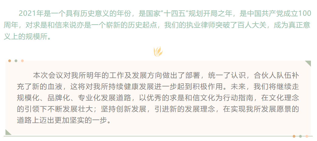 『求是动态』山东求是和信律师事务所合伙人会议第四十三次会议成功召开 来源:求是和信网 日期:2022-01-17 15:41 发布人:qshx 浏览量: 3666 上一篇:『求是资讯』潍坊市贯彻落实《著作权纠纷“三调一诉”实施办法》座谈会在我所召开 下一篇:求是动态 | 我所青年律师闪耀“大成杯”诉辩赛场 专业素养与团队协作铸就卓越战绩