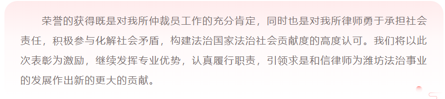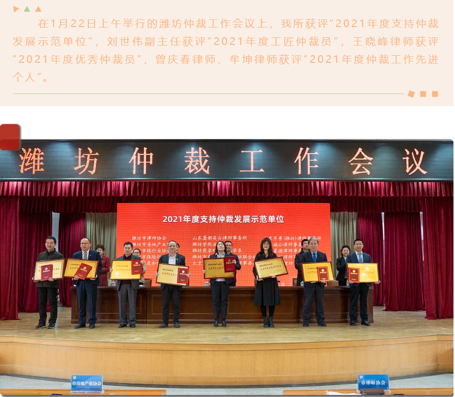 『求是动态』我所及多名律师受到潍坊仲裁委员会通报表彰 来源:求是和信网 日期:2022-02-17 10:24 发布人:qshx 浏览量: 2893 上一篇:『求是资讯』依托我所设立的潍坊市版调委成为2021年度潍坊版权十大亮点之一 下一篇:求是动态 | 我所青年律师闪耀“大成杯”诉辩赛场 专业素养与团队协作铸就卓越战绩