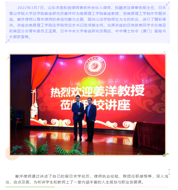 『求是资讯』我所姜洋律师受邀前往南昌理工学院作专题讲座