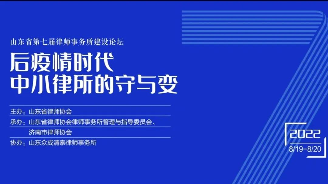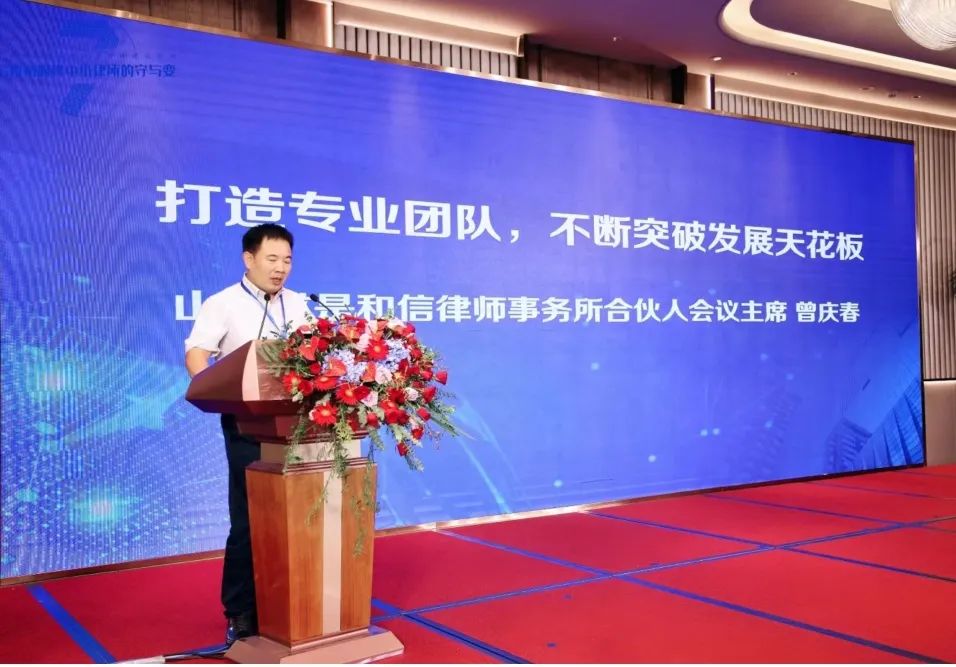 2022年8月19日至20日,山东省律师协会在济南举办山东省第七届律师事务所建设论坛,山东求是和信律师事务所合伙人会议主席曾庆春律师作为特邀嘉宾参加论坛并作主题演讲,城市更新法律事务部主任马恒明律师及部分行政法律中心律师全程参会。