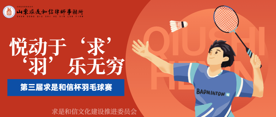 为了丰富律师们的业余生活,加强羽毛球爱好者之间的技术交流、增进友谊,2022年11月19日,我所文化建设推进委员会举办了"悦动于'求'、'羽'乐无穷"——第三届求是和信杯羽毛球赛。此次比赛是庆祝我所成立30周年的系列活动之一,也是践行我所提出的建设幸福律所的具体活动之一。