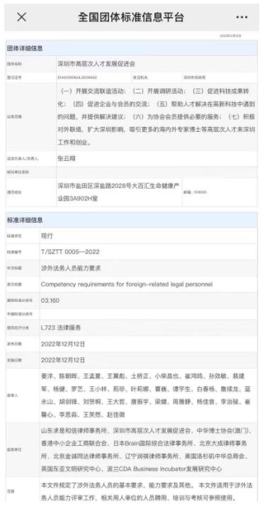 深圳市高层次人才发展促进会执行秘书长王孟夏表示,该团体标准制定后,深圳市高层次人才发展促进会还会陆续推出与之相配套的业务培训和能力评定等,旨在将这一标准所体现的先进理念和实践经验不断推广,充分助力涉外法务人才群体内涵式发展。