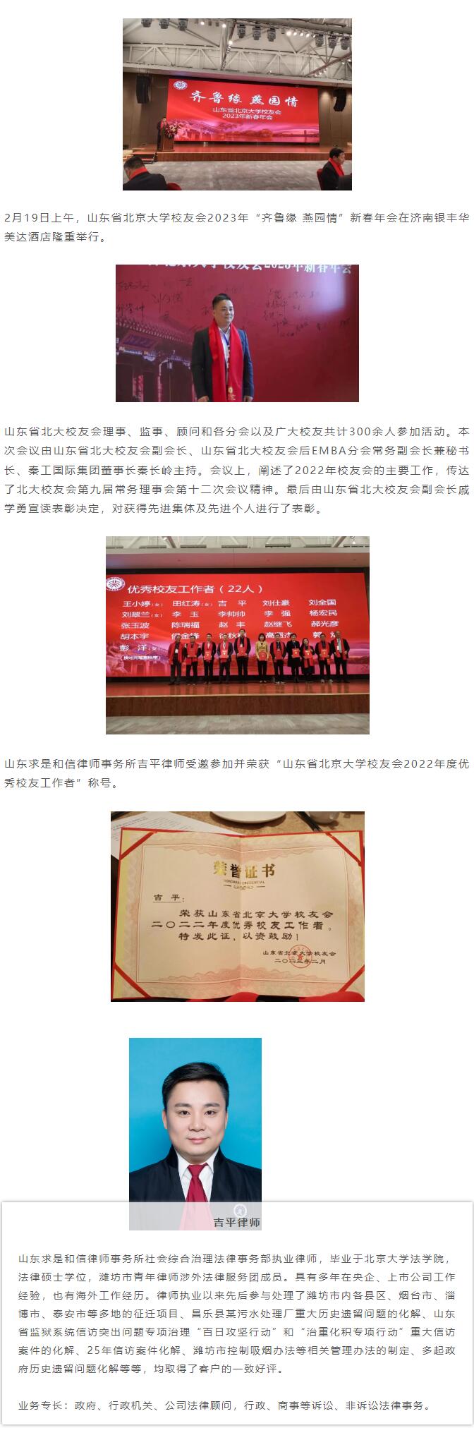 求是动态 | 吉平律师荣获“山东省北京大学校友会2022年度优秀校友工作者” 来源:求是和信网 日期:2023-02-21 14:07 发布人:qshx 浏览量: 1085 上一篇:求是动态 | 姜洋律师受邀参加《商法之声》栏目开播仪式暨潍坊国际商会涉外法律专委会年度工作会议 下一篇:求是动态 | 我所青年律师闪耀“大成杯”诉辩赛场 专业素养与团队协作铸就卓越战绩