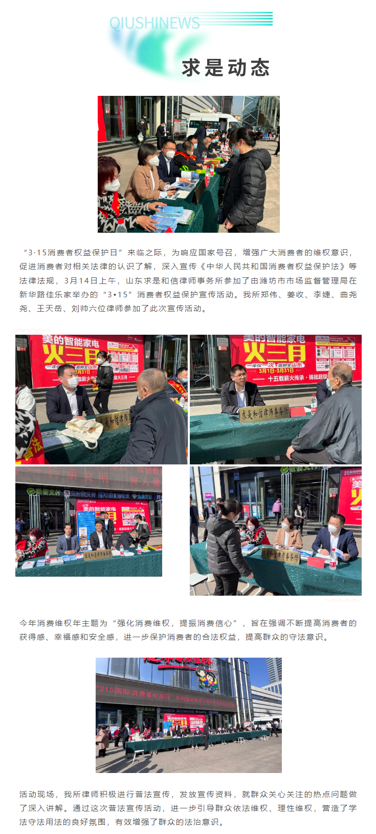 求是动态 | 求是和信律师参加“3•15”消费者权益保护宣传活动 来源:求是和信网 日期:2023-03-14 15:16 发布人:qshx 浏览量: 1770 上一篇:求是动态 | 武艳霞律师参加潍坊市党外知识分子联谊会2023年第一次会长办公会 下一篇:求是动态 | 我所青年律师闪耀“大成杯”诉辩赛场 专业素养与团队协作铸就卓越战绩