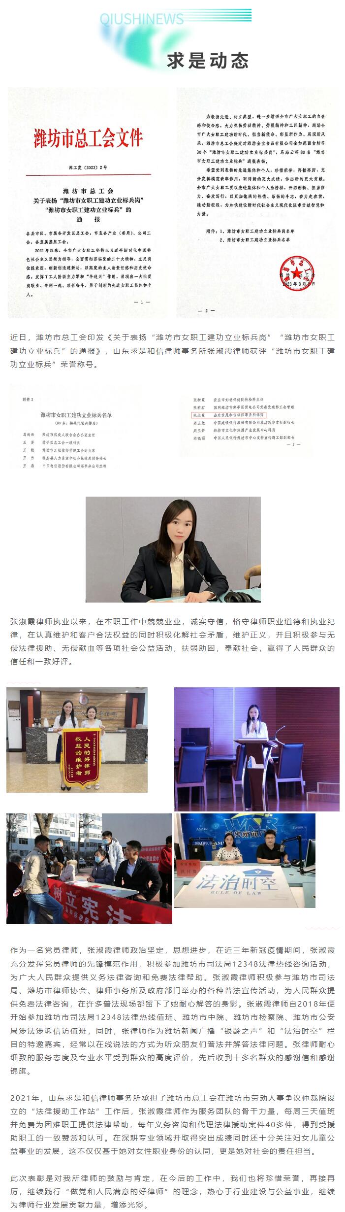 求是动态 | 张淑霞律师荣获“潍坊市女职工建功立业标兵”荣誉称号