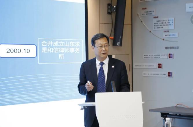 我所主任马东宁向各位来宾分享了对律师事务所管理的认识和体会。马主任回顾了求是和信律师事务所三十年来的发展过程,并结合自身经验从律师事务所的党建、文化建设、经营管理机制等方面分享了我所的经验和做法。