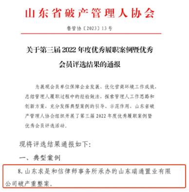 求是荣誉 | 我所担任管理人的破产重整案入选山东省2022年度十大破产典型案例