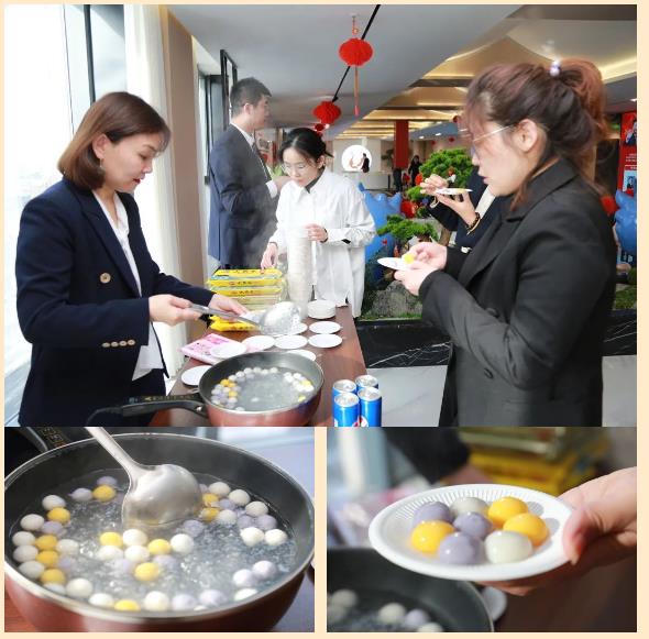 随着一阵阵扑鼻的香气,一碗碗白糯糯热腾腾的汤圆很快就摆满了桌面。象征着节日喜庆的汤圆,小小一枚,包着团圆,裹着甜蜜,大家对软糯可口又饱含浓浓祝福的汤圆赞不绝口,分享着彼此的趣事,现场温馨而美好……
