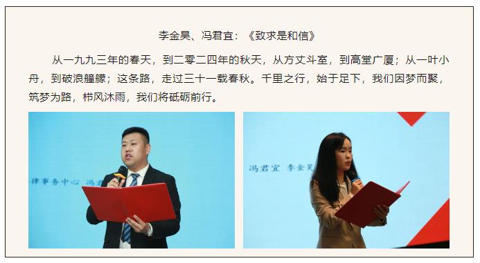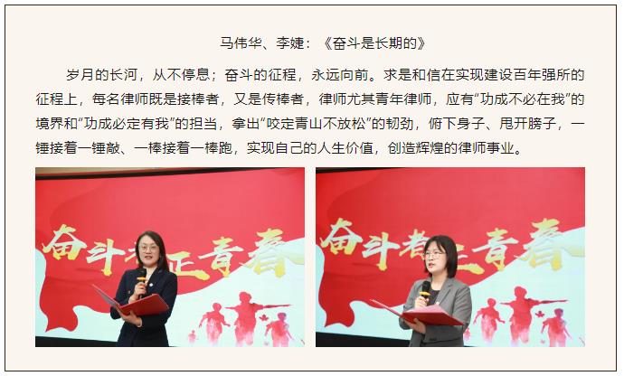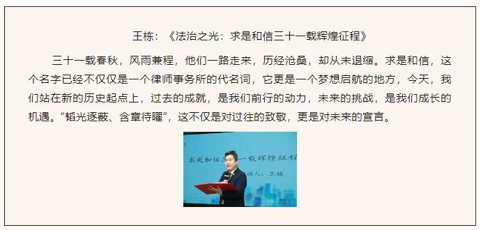 在刘淑萍律师的精彩主持下,诵读活动正式拉开帷幕。参与本次活动的22名律师携卷登台,倾情诵读,用自己真挚的语言,饱含深情地述说了求是和信三十一年来砥砺奋进的光辉历程和改革发展中取得的不易成就,表达了对求是和信深深的热爱和对美好未来的期待与祝福,充分展现了求是人的激情与豪迈,更加坚定了我们在新时代奋进新征程的信心和决心。