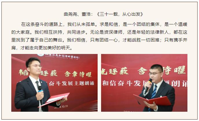 来源:求是和信网 日期:2024-10-21 08:44 发布人:qshx 浏览量: 1249为庆祝建所31周年,展现山东求是和信律师事务所职工良好的精神风貌,传承一代代求是人艰苦奋斗、自强不息、与时俱进、锐意进取的拼搏与奉献精神,10月19日,我所文化与建设推进工作委员会携求是书院读书会、求是书院演讲主持社隆重举办“韬光逐薮、含章待曜”求是和信奋斗发展主题朗诵会。我所党支部书记、主任马东宁,管理委员会副主任刘世伟、陶书健,管理委员会成员王晓峰、孙明江及全体律师参加了本次活动。