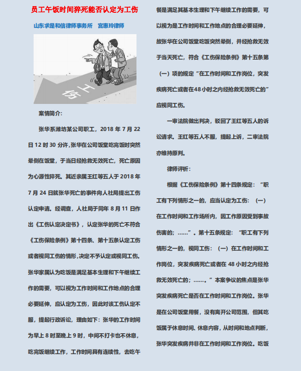 员工午饭时间猝死能否认定为工伤 来源:求是和信网 日期:2021-04-21 15:25 发布人:qshx 浏览量: 3442 上一篇:伪造签名形成的股东会决议,股东该如何救济 下一篇:仅凭借条起诉能否打赢官司存在法律风险