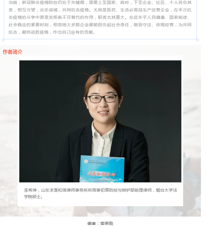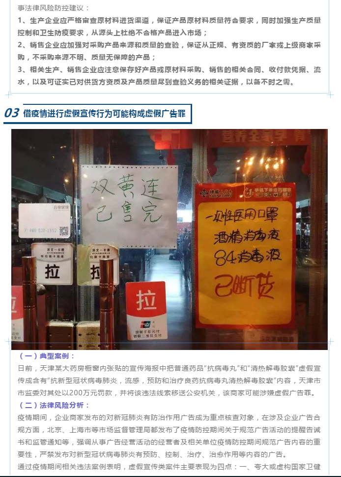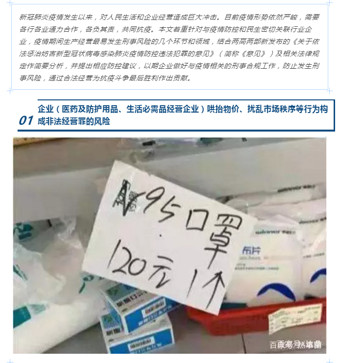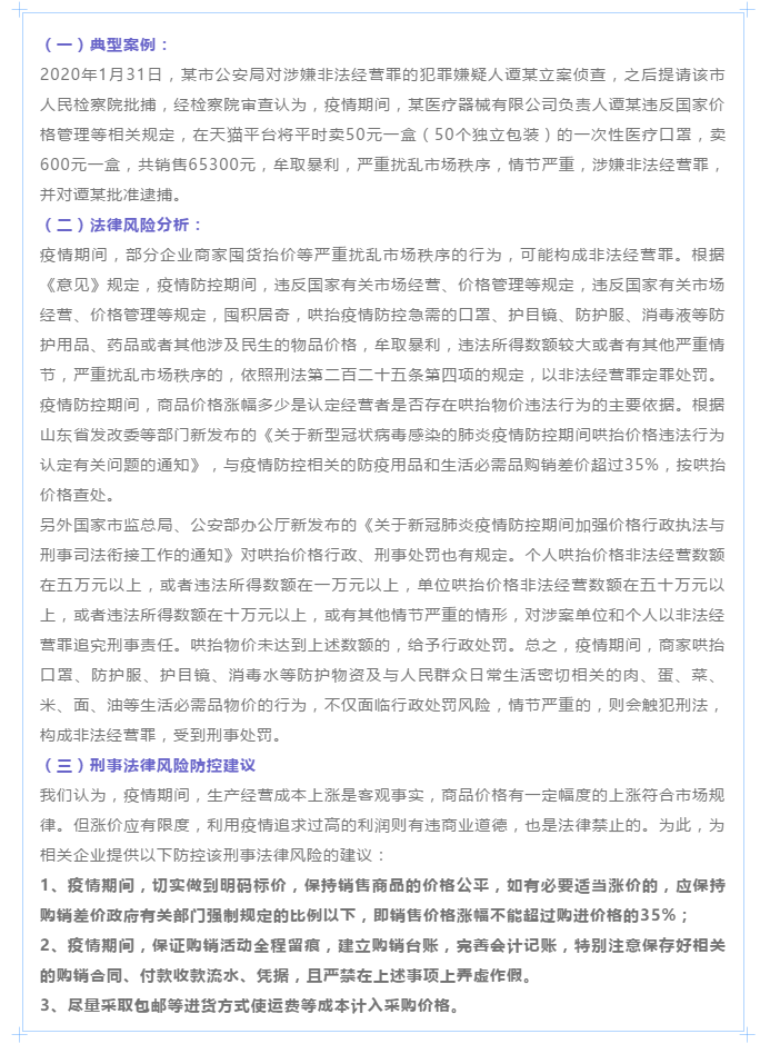 疫情期间企业易发刑事法律风险的若干环节及防控建议 来源:求是和信网 日期:2020-03-12 14:39 发布人:qshx 浏览量: 1250 上一篇:中美经贸协议发布,利剑将出鞘,这些侵犯知识产权行为赶快停止! 下一篇:求是刑辩 | 解得鹏、孙晓蒙律师办理的故意伤害法律援助案件当事人被解除强制措施