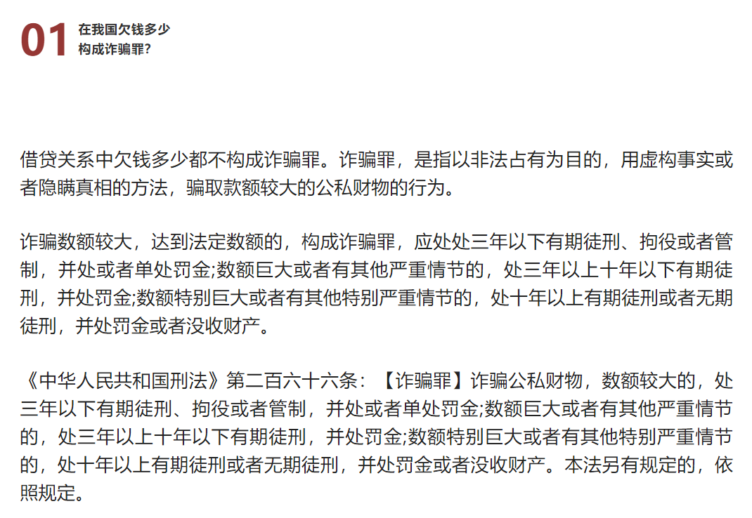 在我国欠钱多少会构成诈骗罪?诈骗罪数额是这样规定的 来源:求是和信网 日期:2021-04-21 15:37 发布人:qshx 浏览量: 3142 上一篇:“亲友被抓,案子啥时候能判?”刑事案件诉讼流程解析 下一篇:求是刑辩 | 解得鹏、孙晓蒙律师办理的故意伤害法律援助案件当事人被解除强制措施