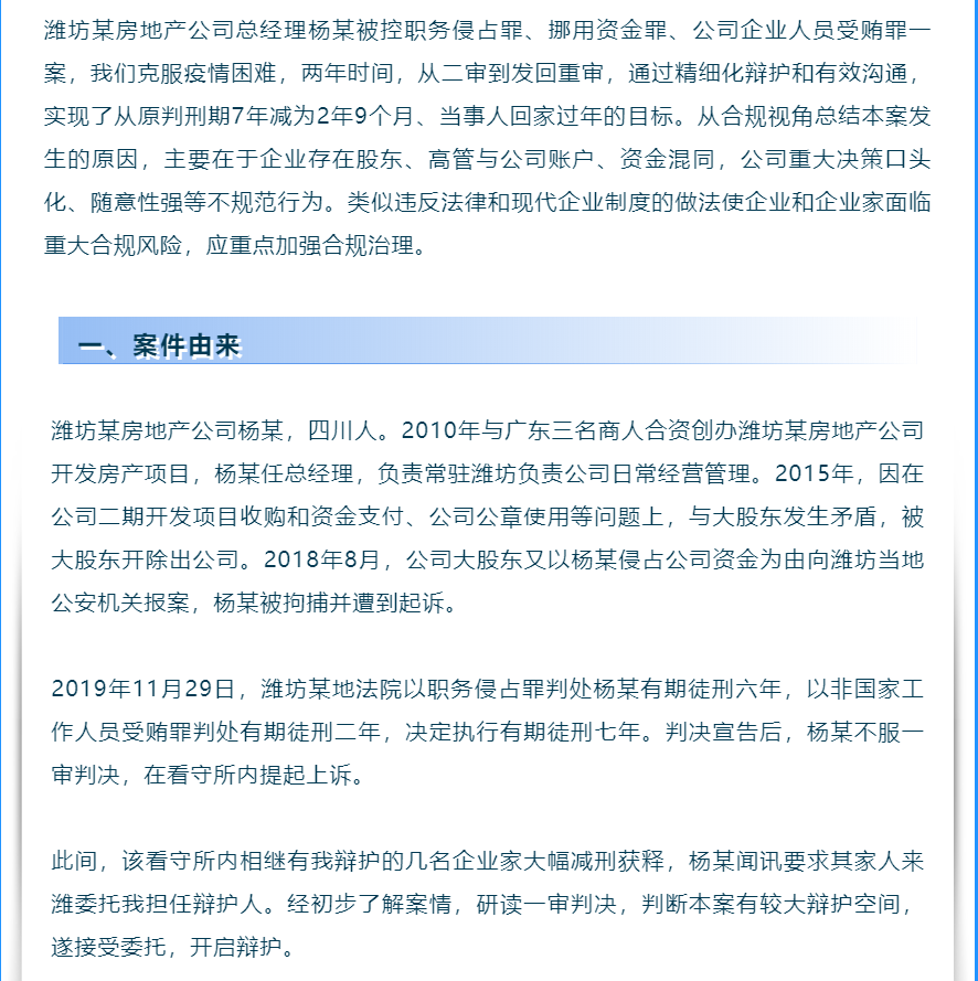 一起商事犯罪案件大幅减刑改判的辩护经验与合规启示 来源:求是和信网 日期:2021-08-05 15:00 发布人:窦荣刚律师 浏览量: 5145 上一篇:在我国欠钱多少会构成诈骗罪?诈骗罪数额是这样规定的 下一篇:求是刑辩 | 解得鹏、孙晓蒙律师办理的故意伤害法律援助案件当事人被解除强制措施