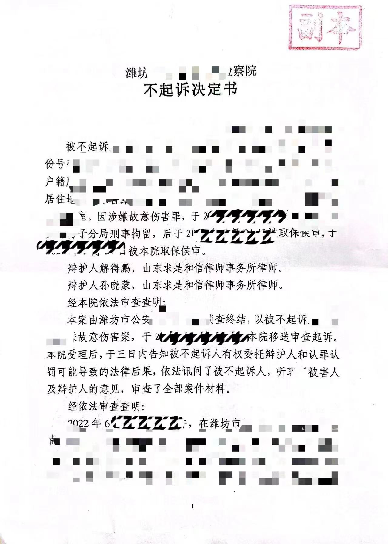 2022年10月底,潍坊市某区检察院对我所刑事法律中心解得鹏、孙晓蒙律师办理的故意伤害罪案件当事人作出相对不起诉决定。